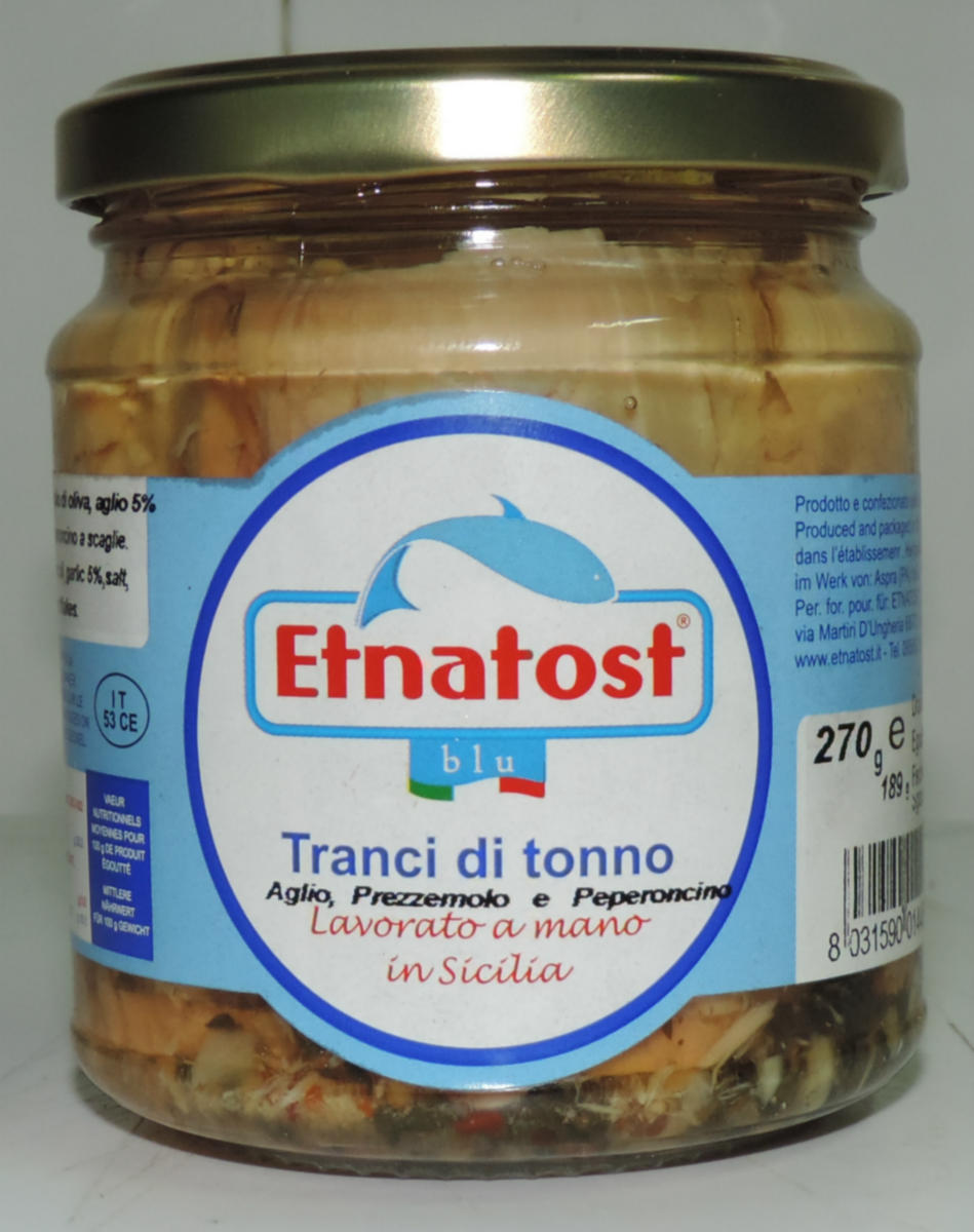 Barattolo in vetro di Tonno pregiato a tranci all’Olio di Oliva Origine e Lavorazione Siciliana